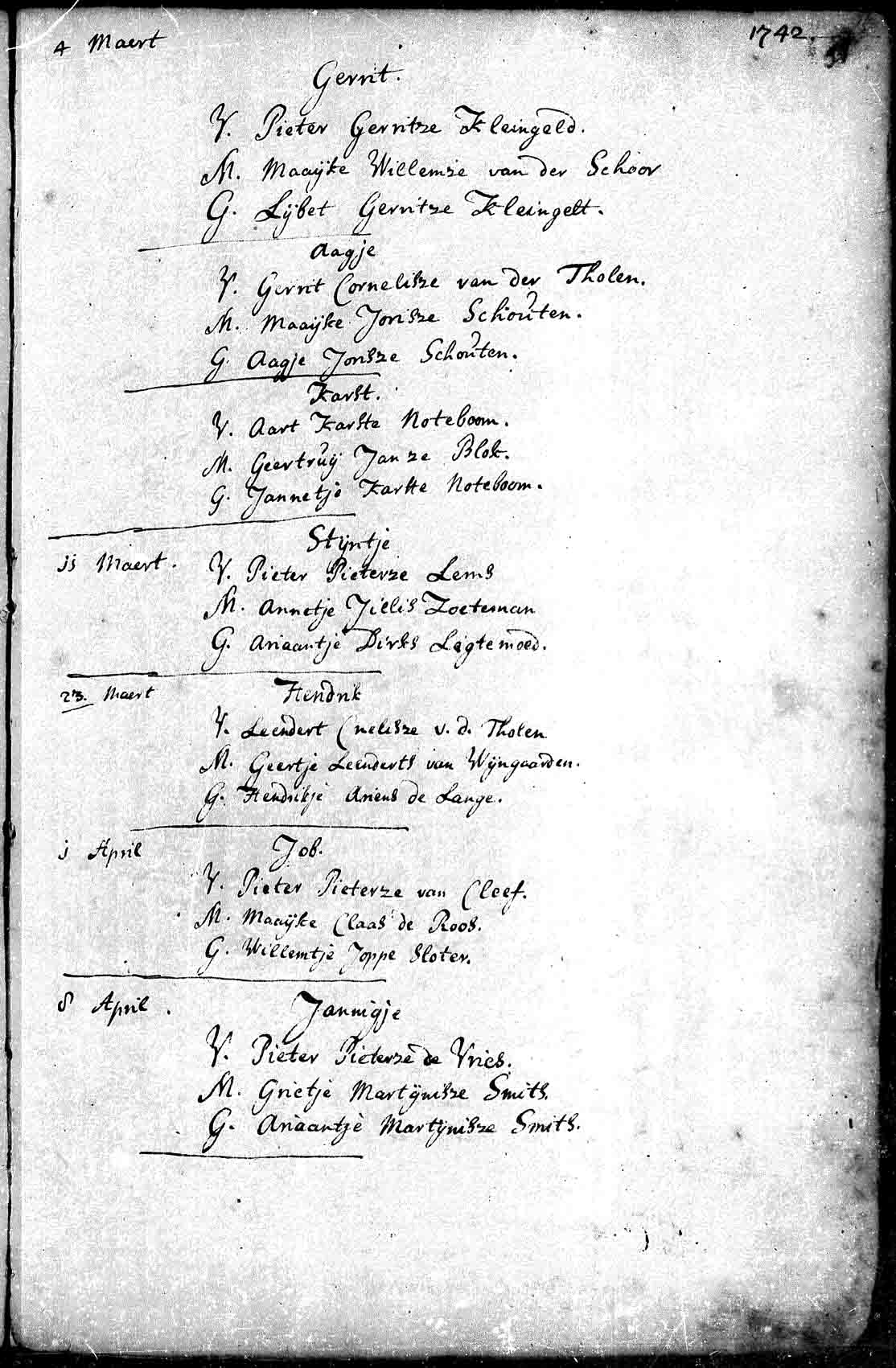 Op de doopakte komt ook een Aagje voor, gedoopt op 4 maart 1742, dochter van Gerrit Cornelisz van der Tholen, zij is het nichtje van Hendrik.